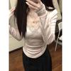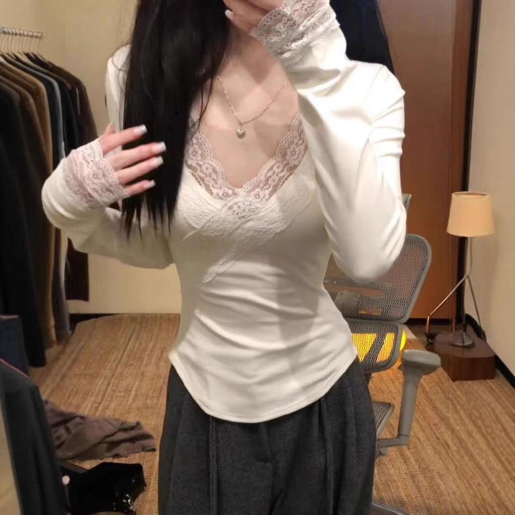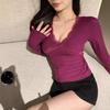 French Lace Trim Velvet V-Neck Shirt: Slim Fit, Long Sleeve Women's Korean Style Top for Autumn/Winter