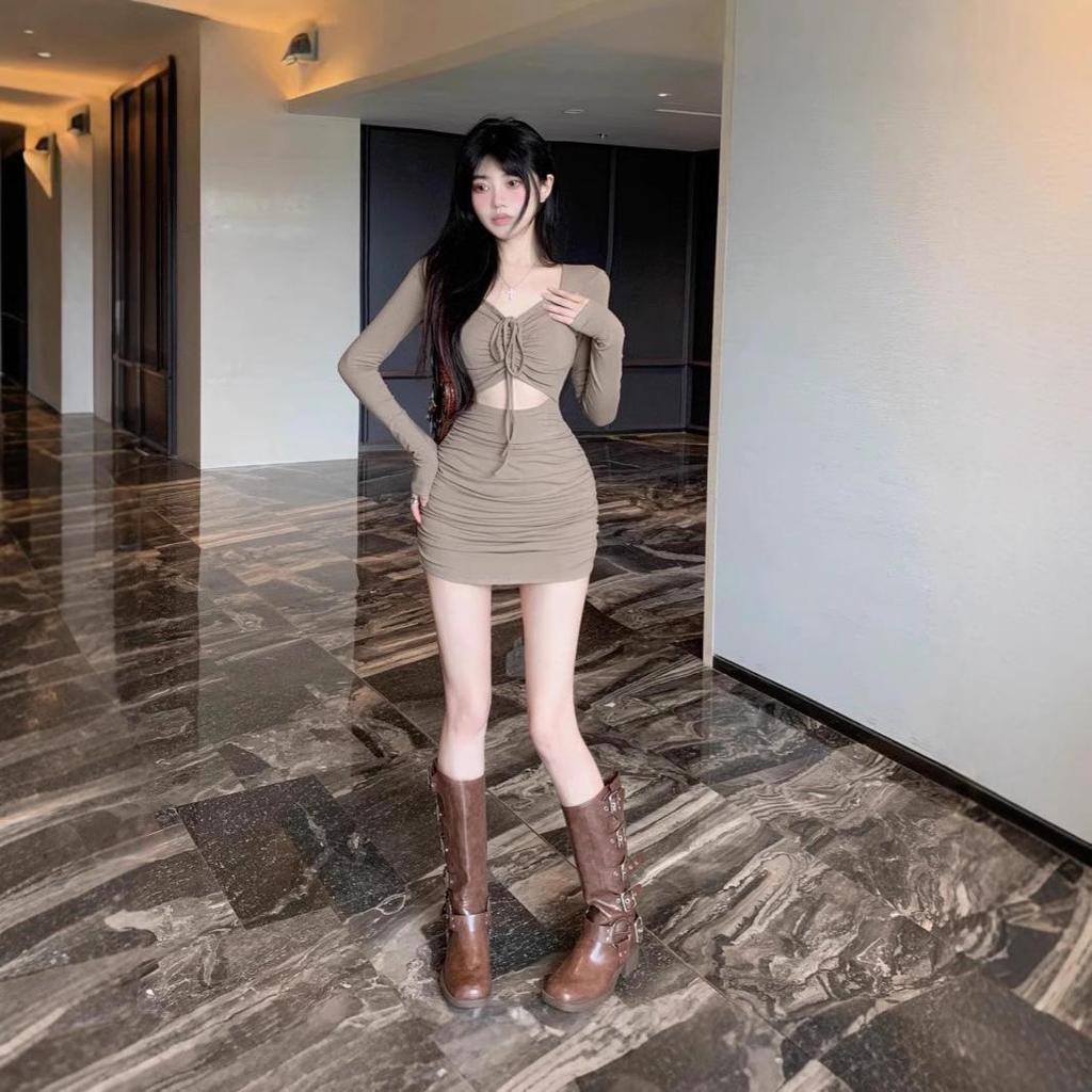 2025 Spring & Autumn French Retro Sexy Bodycon Drawstring Dress for Women