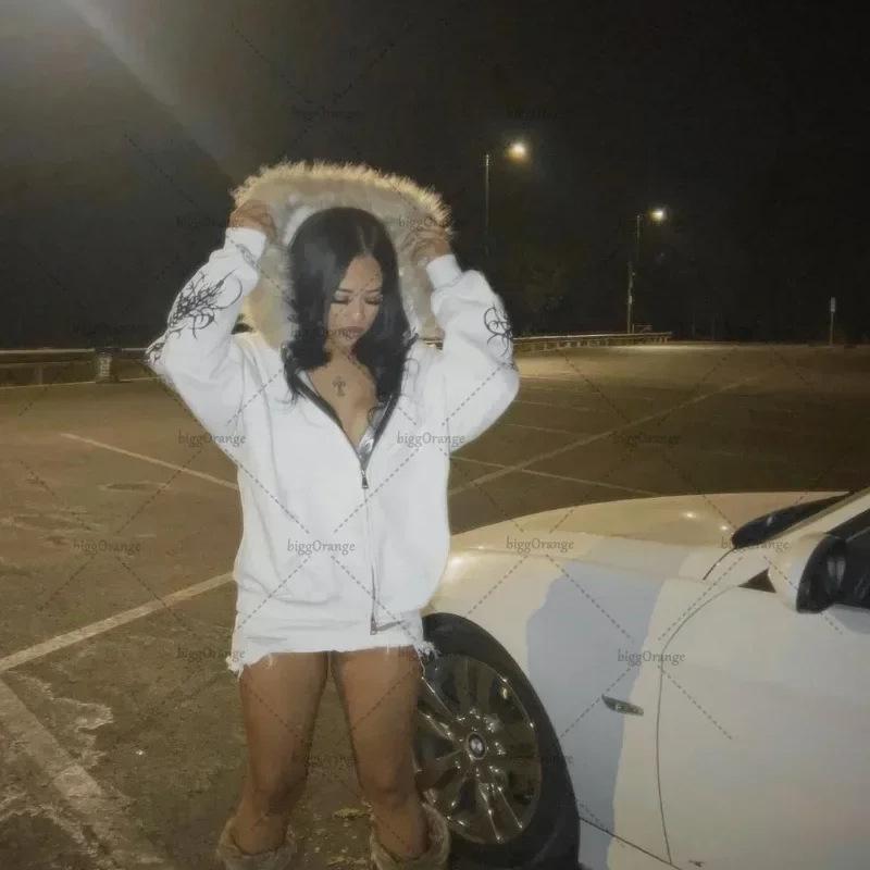 2024 Bad Boy Influencer Cárdigan con Capucha y Cremallera con Cuello de Piel - Nueva Parte Superior Estampada para Chica Hot