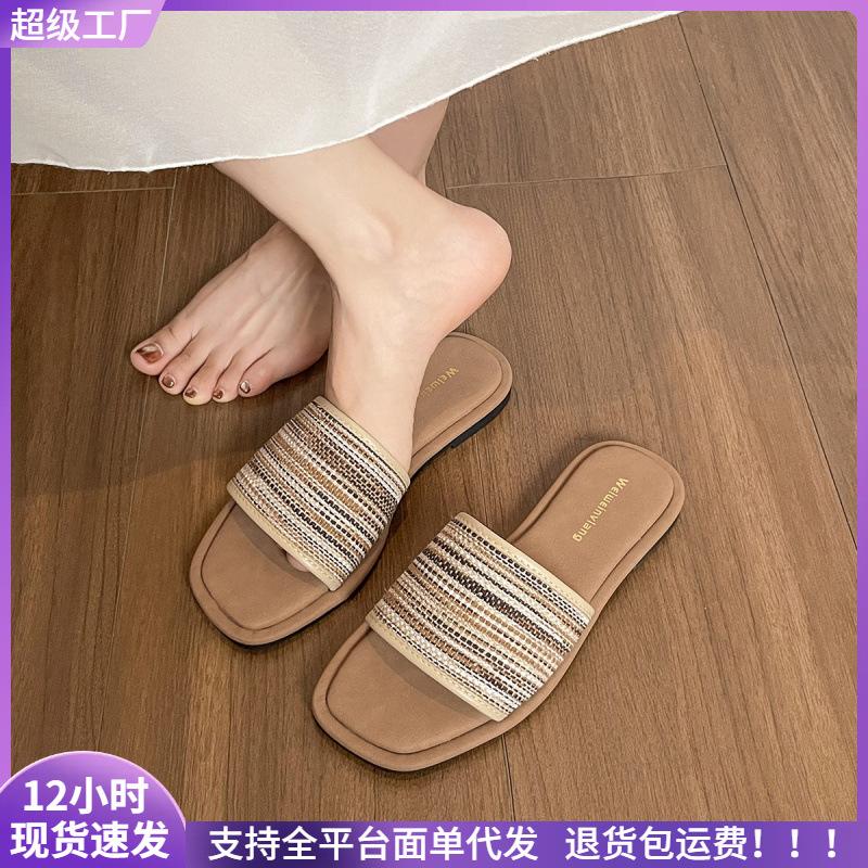 Flat bottom woven one-word slippers women's summer wear retro skirt Roman cool slippers