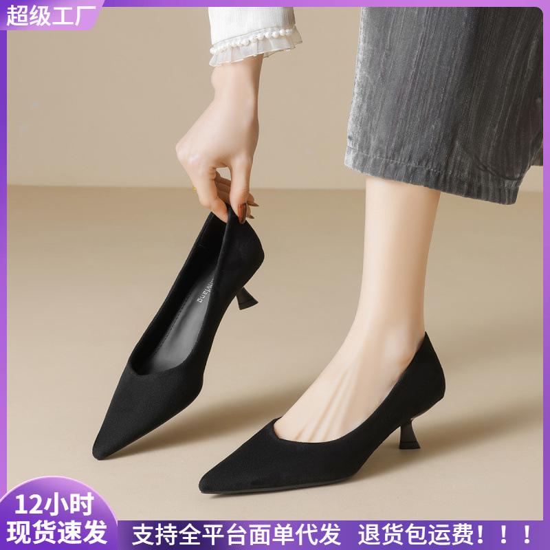Suede pointed single shoes women's stiletto black commuter work shoes cat heel shallow high heels