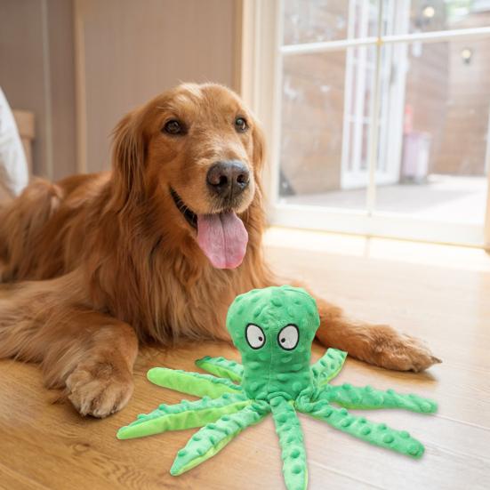 Construcción de poliéster duradero: Confeccionado con poliéster de alta calidad, este peluche de pulpo para perro está diseñado para resistir la masticación moderada, asegurando un tiempo de juego duradero para tu amigo peludo.