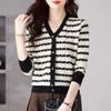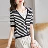 Cárdigan de punto con cuello en V para mujer, verano, holgado, a rayas contrastantes, manga corta, moda, chaqueta de viaje, top