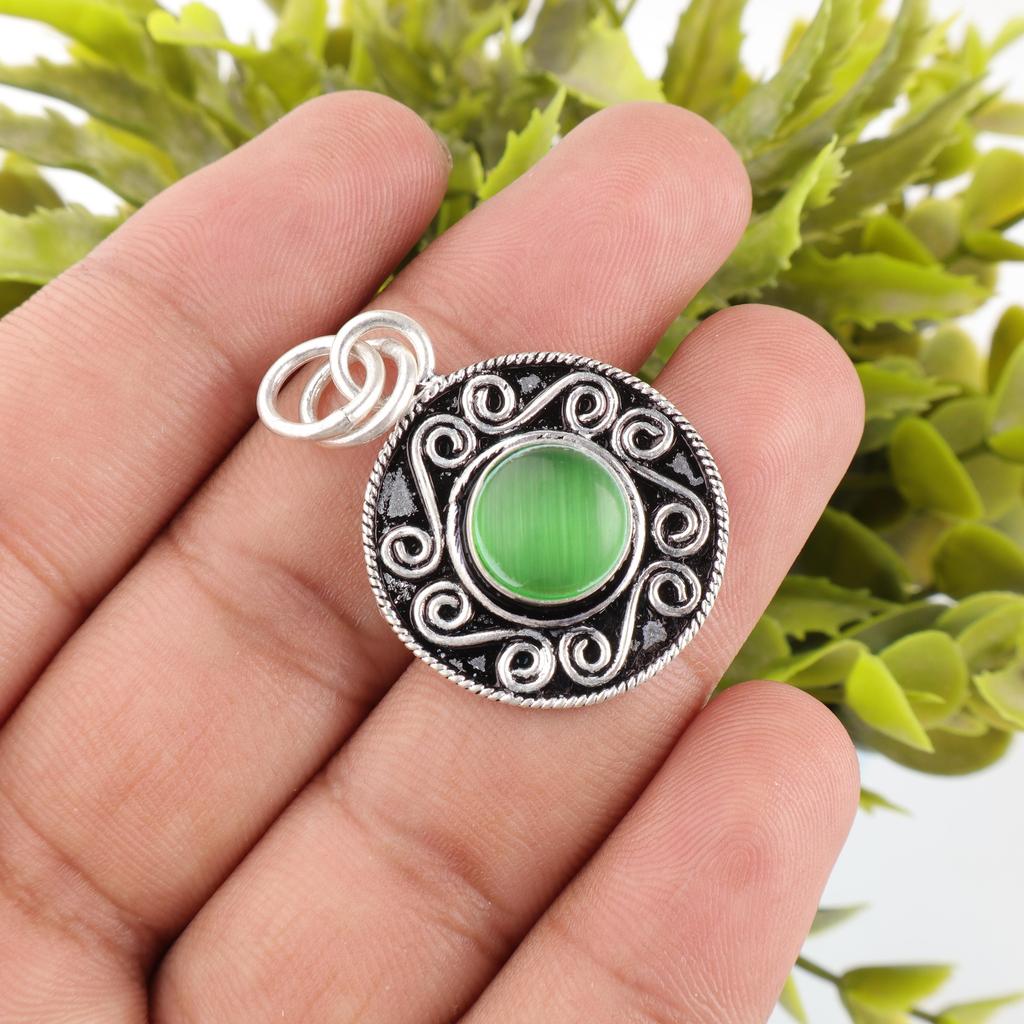 Green Cat's Eye Gemstone Jewelry, 925 Solid Sterling Silver Pendant , Handmade Spiritual Pendant For Wedding Gift