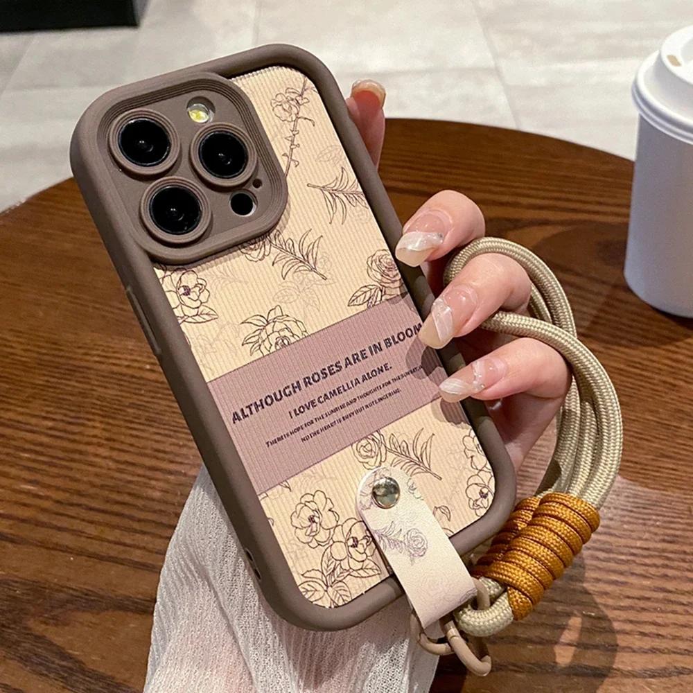 Luxury Camellia Wrist Strap Phone Cases for iPhone 13 11 14 15 Plus 12 16 Pro Max X XR XS 15pro MAX Case Silicone Lanyard Cover
