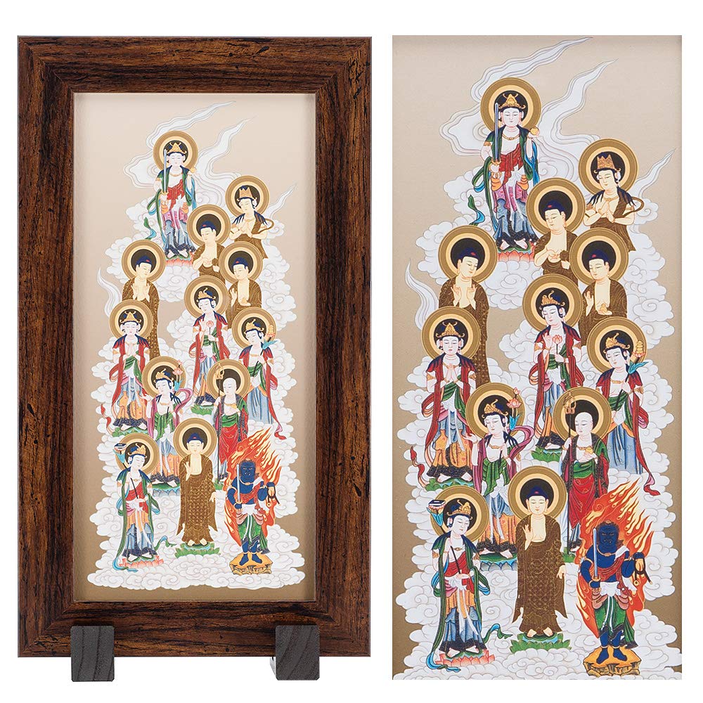 This is a compact-sized hanging scroll of Thirteen Buddhas that can be displayed on a desk or table. It has a modern design with a wooden frame that blends in with living rooms and Western-style rooms. It is a free-standing stand type, so you can easily display it without nails, screws, or a hanging scroll stand.
