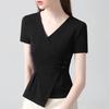 Short-sleeved T-shirt Women with Cross V Neck Button Cotton T-shirt Irregular Hem Waist Top