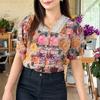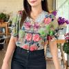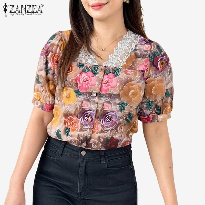ZANZEA Women Summer Lace Splice V-Neck Short Sleeve Floral Print Blouse