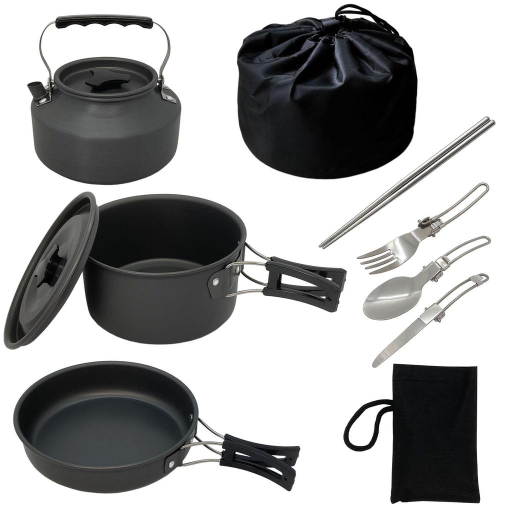 This is an outdoor cooker set that is useful for outdoor activities, camping, barbecues, etc. It can be stored compactly, making it easy to carry. The cooker and kettle are made of aluminum alloy, which has high thermal conductivity, high hardness, and is resistant to high temperatures and friction. [Heat-resistant handle] The handles of the cooker and kettle are made of synthetic resin, so they are easier to use than metal handles due to their insulation and anti-slip properties. The pot is anodized, so it is easy to remove dirt and burnt food by simply wiping it off. [Cooking pot] Diameter 17cm x Height 9cm, [Frying pan] Diameter 18cm x Height 4.5cm, Handle 10cm, [Kettle] Capacity: 1.1 liters, Diameter 15cm x Height 8cm, Spoon size: 160 x 40 (mm), Knife size: 165 x 12mm, Fork size: 160 x 12mm, Chopstick size: 18.2cm (9.4cm), Weight: 810g, Packing size: 18.5 x 12.3 x 18.5cm, [Material] Aluminum alloy, synthetic resin, stainless steel, Country of origin: China *Cannot be used with induction. Depending on the heat, the handle may become hot, so please be careful when using. Also, do not expose the plastic part of the handle to fire.