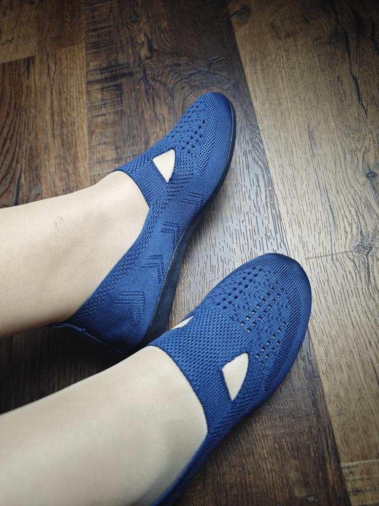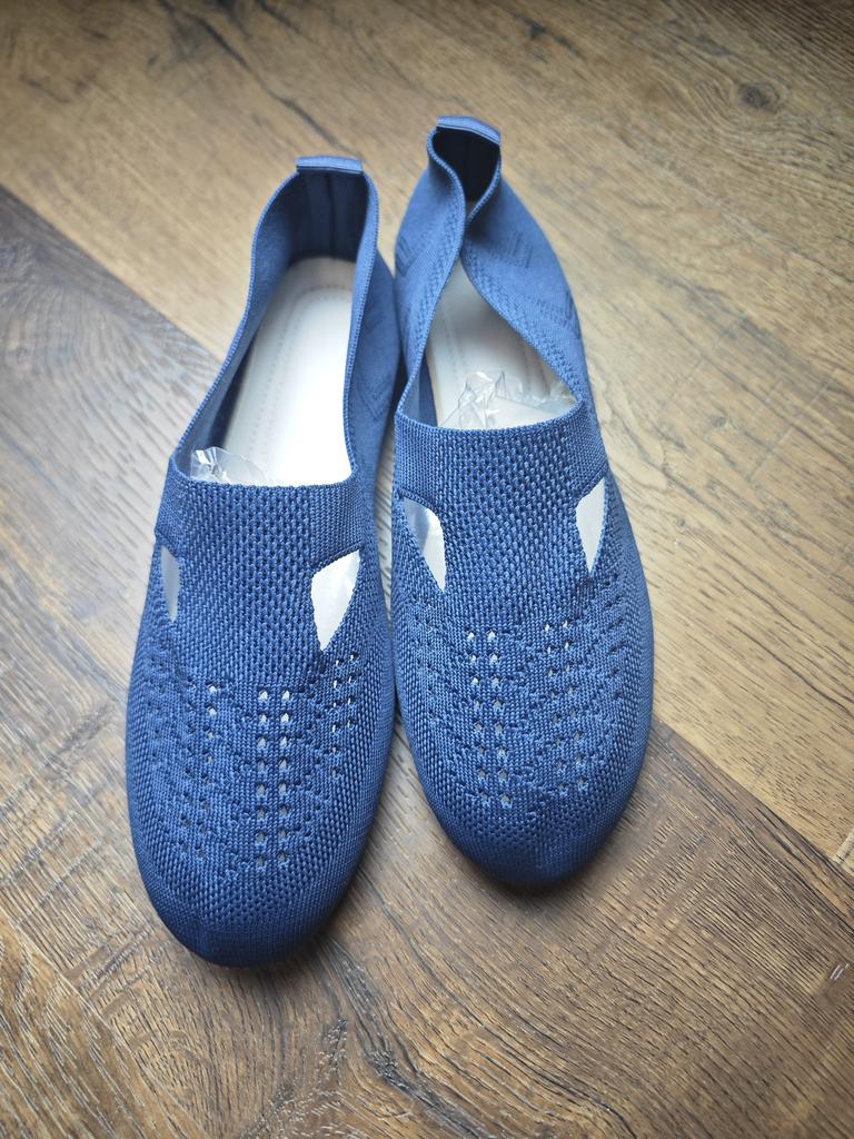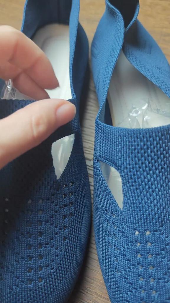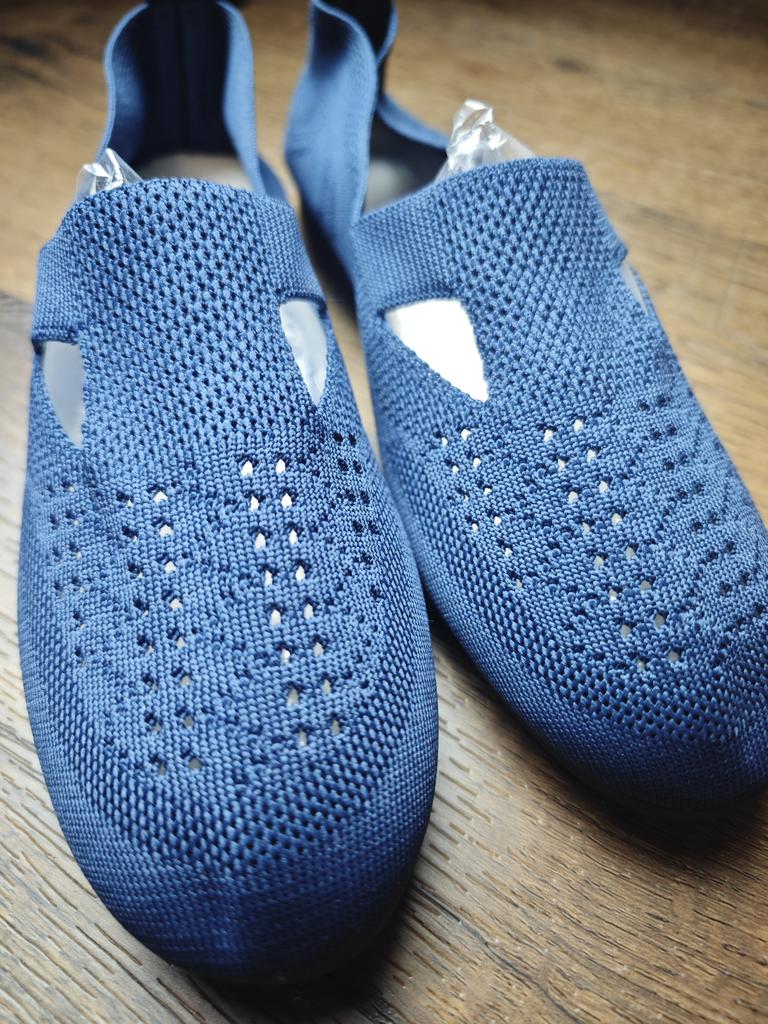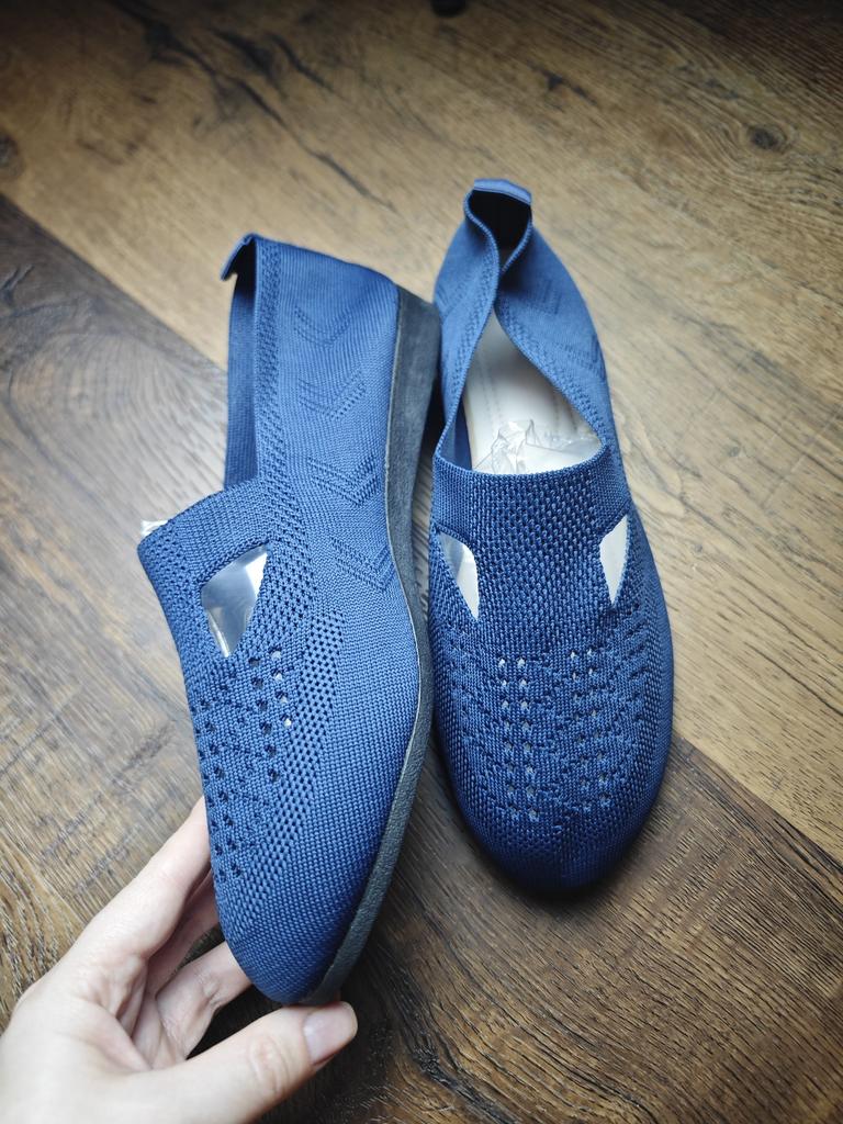 Cómodas bailarinas de punto. ¡Ligeros, hermosos! Son como tejidos, y gracias al tejido diferente están decorados con un hermoso patrón sombreado. No solo son transpirables por sí mismos, sino que también tienen recortes como sandalias. Muy cómodo, no lo sientes en absoluto en los pies.! Se estiran un poco y se sientan en la pierna.. Adecuado para pies anchos y pies problemáticos con valgo.. Pedí, como de costumbre, la talla 43 para una longitud de pie de 26,5 cm. Me quedaron justo.