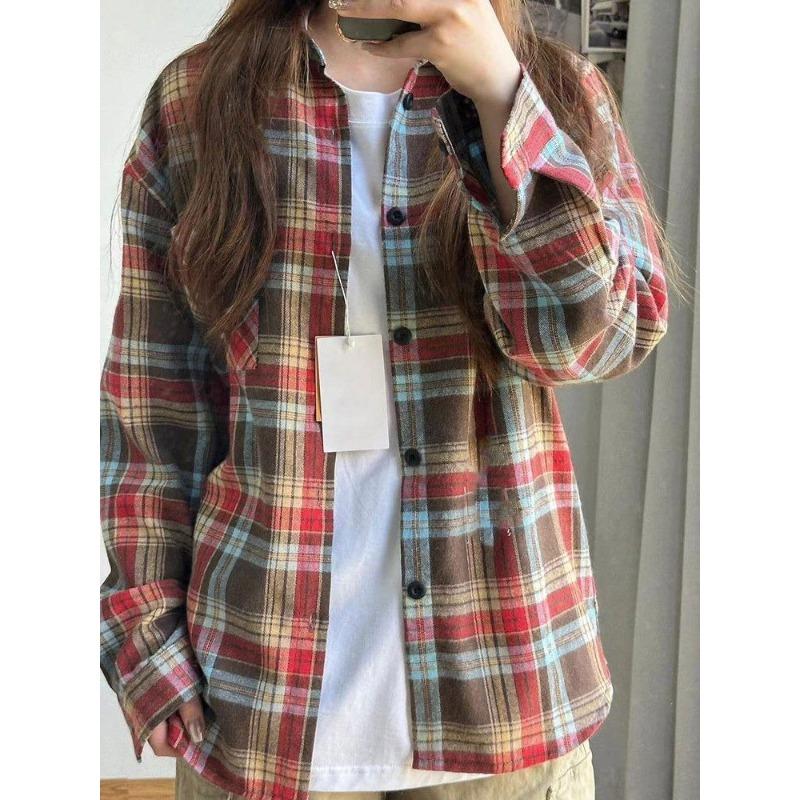 Women Checkered Shirts Contrasting Color Design Single Pocket Lapel Bloues Korean Loose Versatile Ladies Cardigan