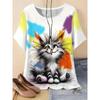 Camiseta de Verano para Mujer, Moda Casual Holgada Talla Grande con Estampado de Gato, Cuello Redondo, Manga Corta, 3D