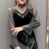 Nuevo Top de Manga Larga Versátil Sexy de Moda para Mujer de Malla con Empalme de Primavera y Otoño, Cuello Medio Alto, Encaje y Pedrería, Corte Slim