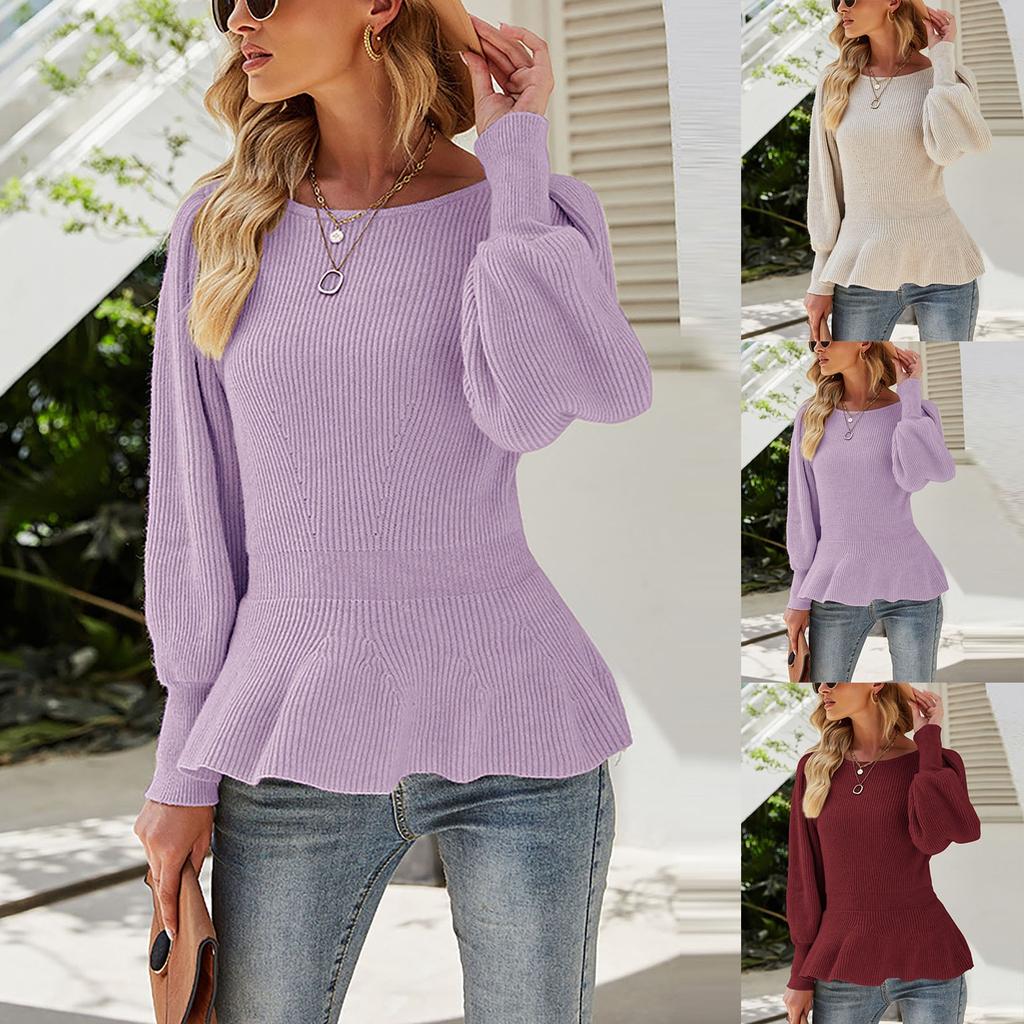 Women's Fashion Waist Collection Sleeve Knitting European And American Women's Solid-color Knitted Sweater
