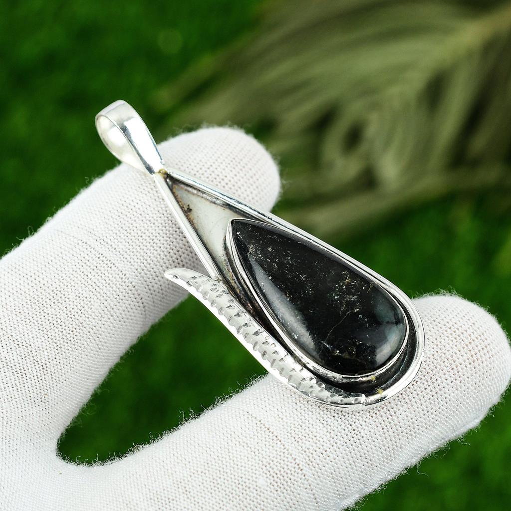 925 Sterling Silver Pear Nuummite Gemstone Daughter Bezel Wedding Unique Pendant