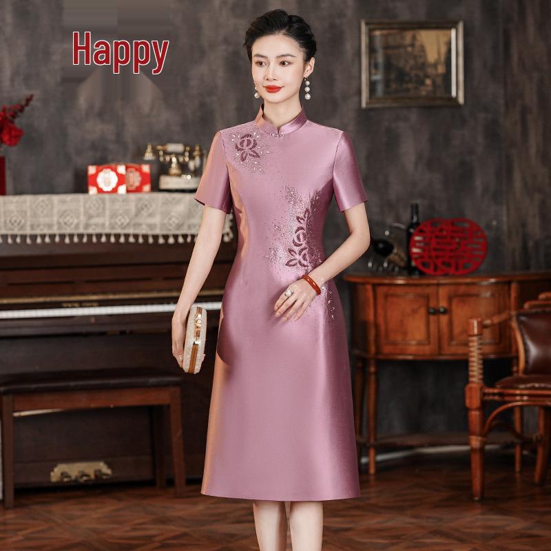Introducing an elegant and stylish spring cheongsam dress designed for middle-aged and elderly women. This fashionable outfit perfectly blends traditional Chinese elements with modern flair, making it an ideal choice for wedding banquets and special occasions. Crafted from high-quality satin, the dress offers a luxurious feel and exquisite drape, ensuring both comfort and sophistication. Its timeless design and flattering fit make it a must-have addition to any wardrobe, capturing the essence of classic elegance with a modern twist.