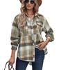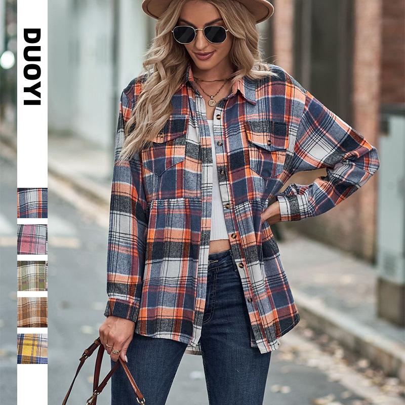 Camisa de Cuadros Azul Naranja Blanco para Mujer con Bolsillos, Top Casual de Manga Larga a Cuadros