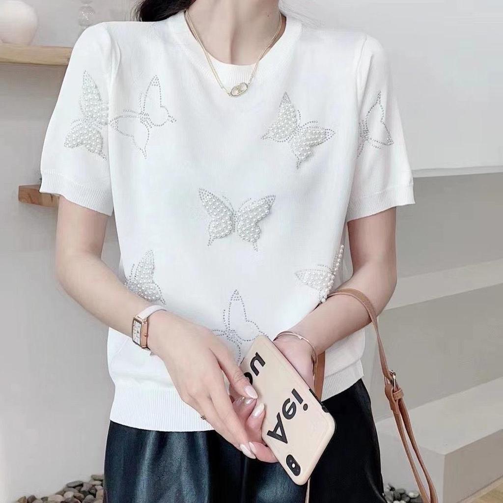 Women's Summer 2025 Butterfly Rhinestone Knitted Top - Ice Silk Short Sleeve, Versatile Round Neck T-Shirt