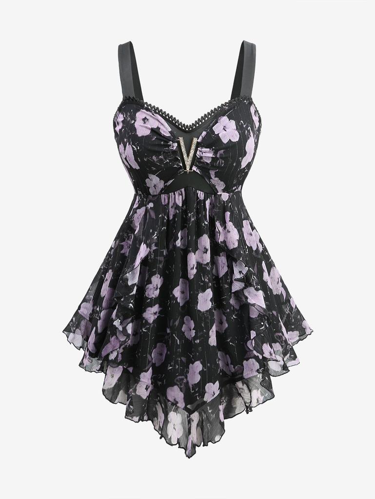 Rosegal Plus Size Flowers Watercolor Print V Buckle Lace Trim Asymmetrical Tank Top