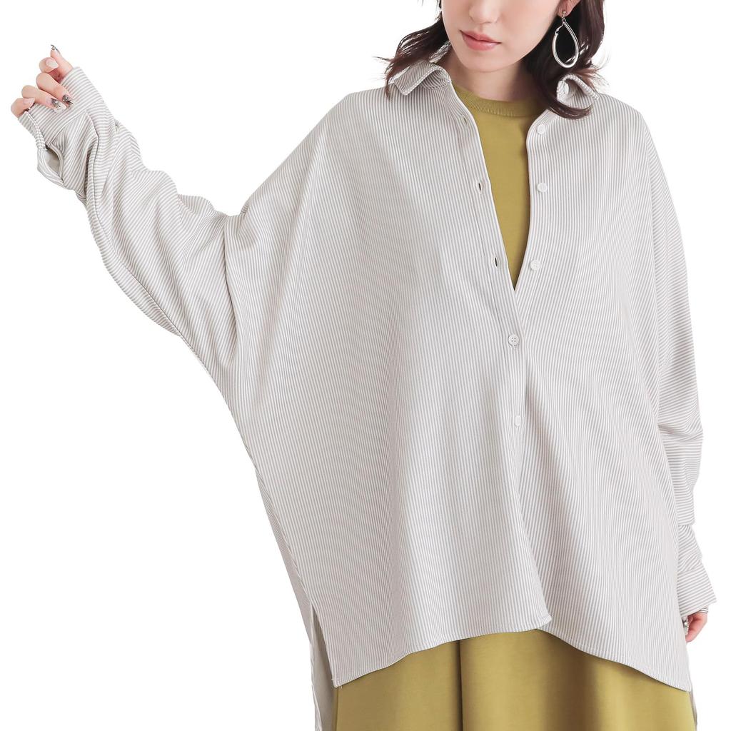 It looks like a shirt, but is stress-free to wear. The striped jersey material is light and stretchy. The fabric has a soft, flowing feel, giving it an elegant impression. Its moderate thickness makes it suitable for a long season.