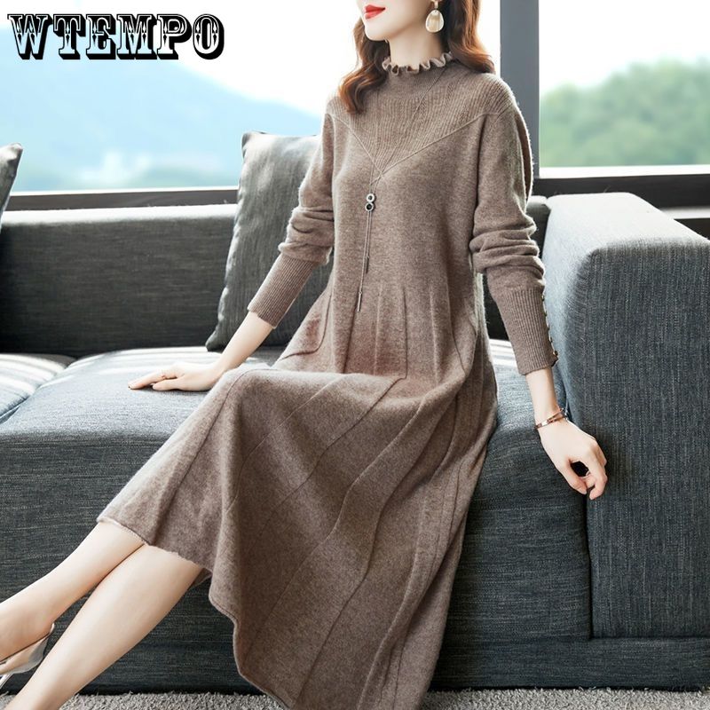 Vestido de Punto Midi Vestido Suéter de Color Sólido para Mujer Vestido Suéter de Punto hasta la Rodilla para Otoño e Invierno para Mujer Jersey