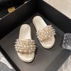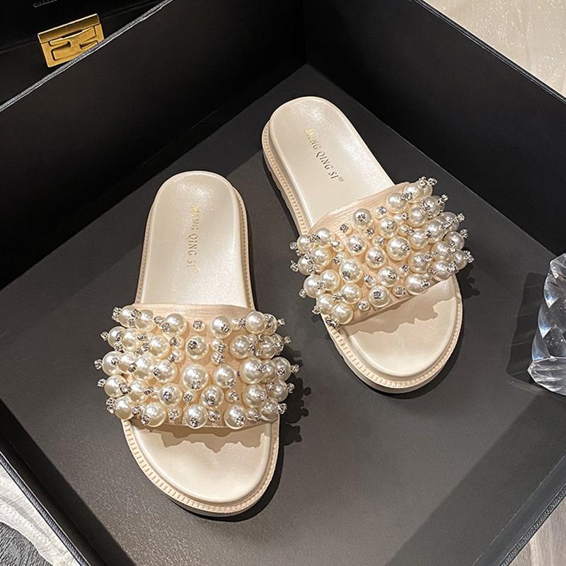 Fashion Elegant Pearl Slippers Woman Beaded Shoes Summer Thicken Soled Sandals Flats Heels Slides Ladies Home Flipper Slip On Flip Flops