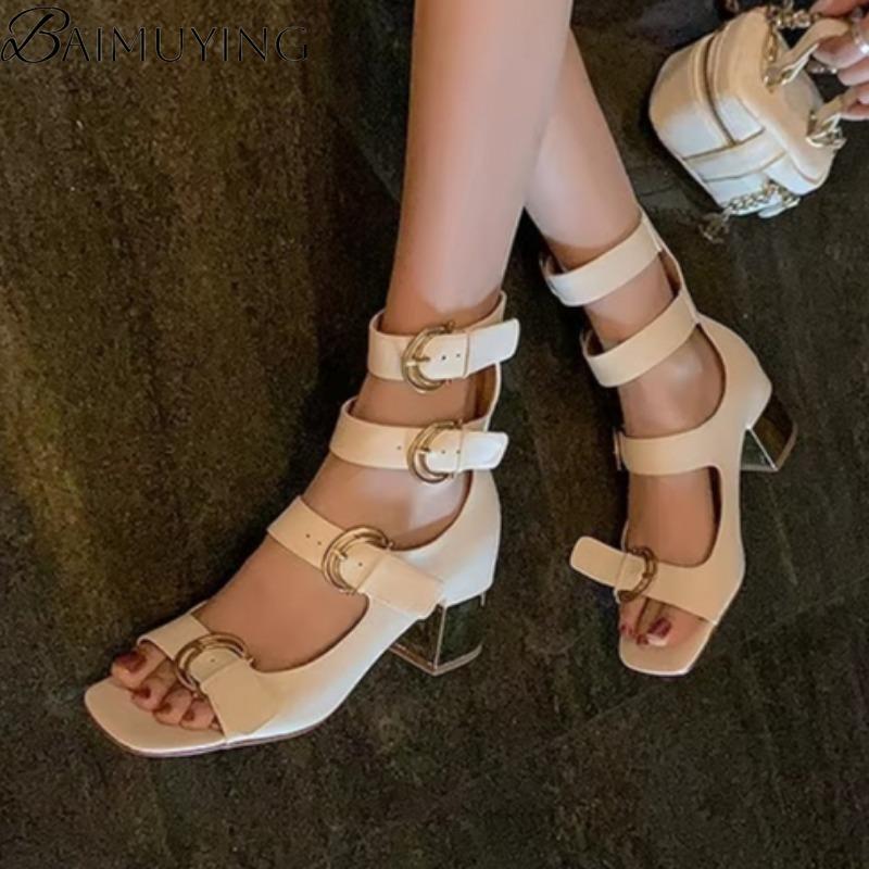 Fashion Women Square Toe Heeled Sandals Buckle High Heels Shoes Woman Summer 2025 Fashion Dress Open Toe Pumps Shallow Chunky Sandalias