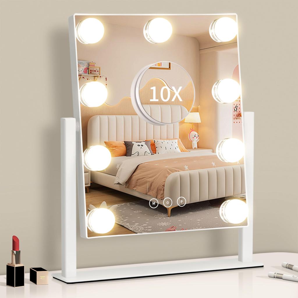 [Large Mirror with 9 LED Bulbs] - This large makeup mirror measures 25cm x 30cm, allowing you to check the overall balance of your face and balance your hairstyle. Light spills in from both the front and sides, and the surrounding light ensures a clear, shadow-free view of your entire face, making makeup application easier. Place it on your dresser or vanity for a Hollywood-inspired look.