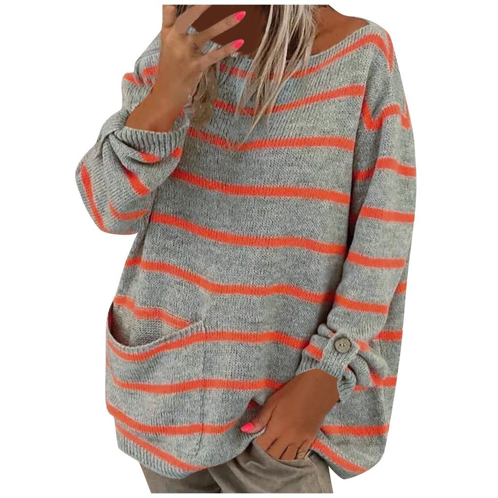 Suéter suelto informal con cuello redondo y rayas en contraste de Color de manga larga para mujer
