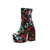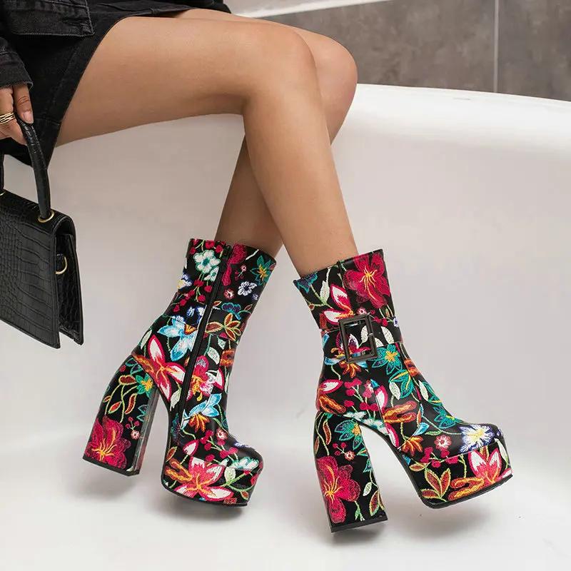 Fashion Women short boots autumn winter flower embroidery thick heel ultra-high heel belt buckle waterproof platform women's ankle boots