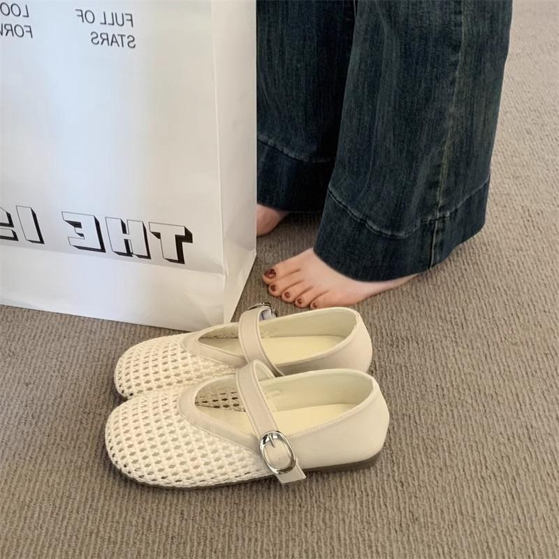 Mary Jane single shoes women's summer new flat bottom soft sole word with mesh hollow woven fishing net shoes sandals