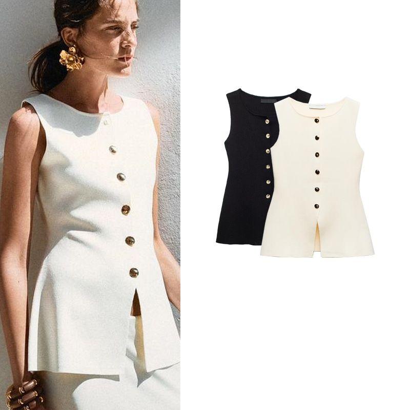 Spring New Women's Clothing Fashion All-Match Golden Button Plain Stitch Sleeveless French Vest Tops 4192100