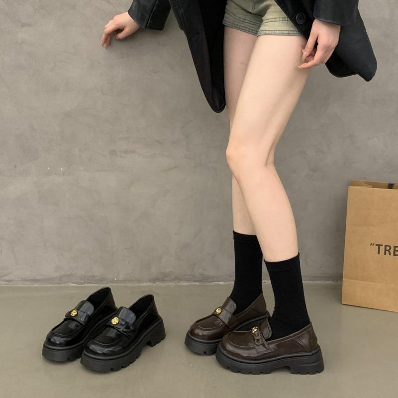 Thick-soled version! Small gold coins increase height, thick heels, small leather shoes, women's spring and autumn versatile black one-pedal loafers