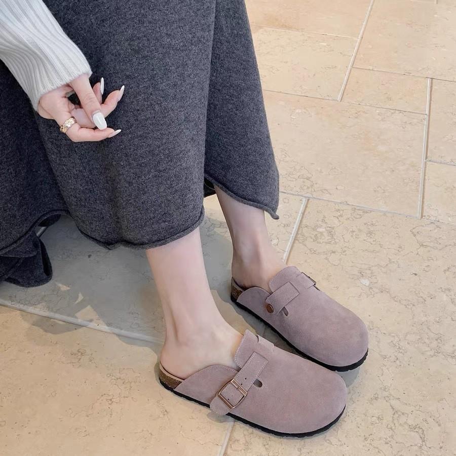 Cowhide version~ Grape mother men and women with the same leather cork Boken lazy people wear h sandals couple half drag Birken shoes
