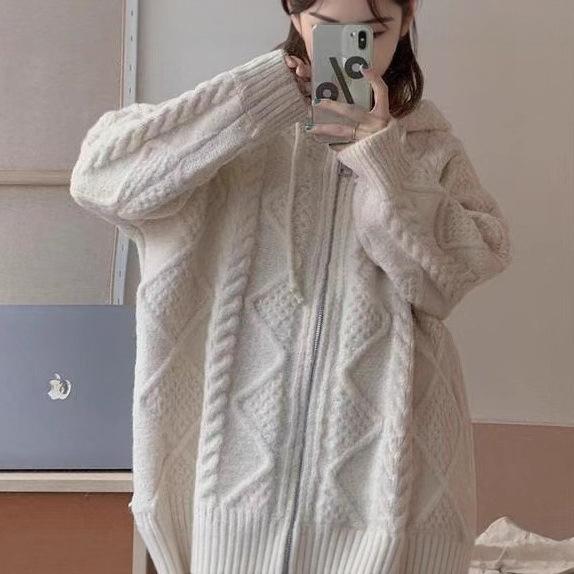 Twist sweater women's autumn and winter new retro loose lazy outer wear knitted sweater hooded cardigan jacket