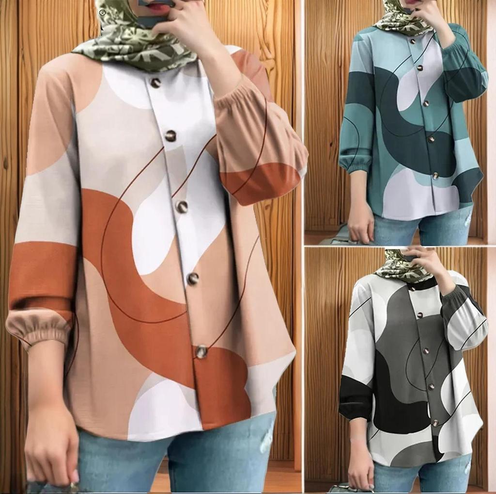 New Arrival: Plus Size Women's Loose Fashion Puff Sleeve Printed Button-Up Shirt