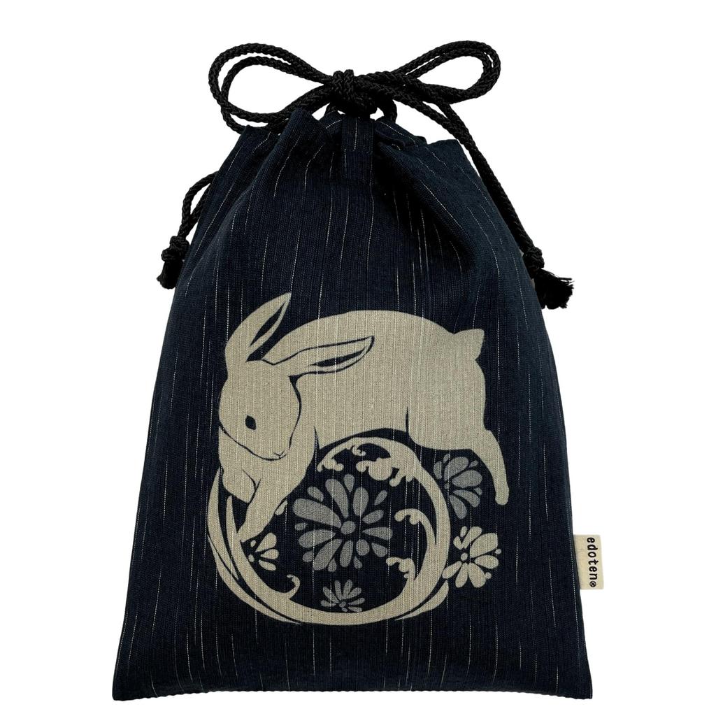 Edoten Shingen Cotton Shijira Drawstring Goshuincho Bag with Inner and 046 Rabbit and Daisy Black Bag, Discharge-Dyed Pattern, 100% Fabric, Bag,