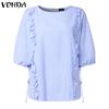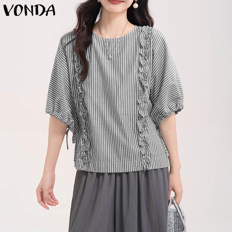 VONDA Women Turn Down Collar 3/4 Sleeve Striped Ruffled Casual Loose Blouse