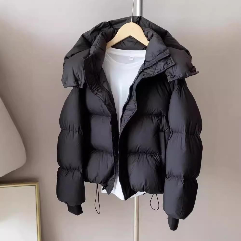 Abrigo Acolchado Grueso Negro para Mujer con Capucha Ajustable