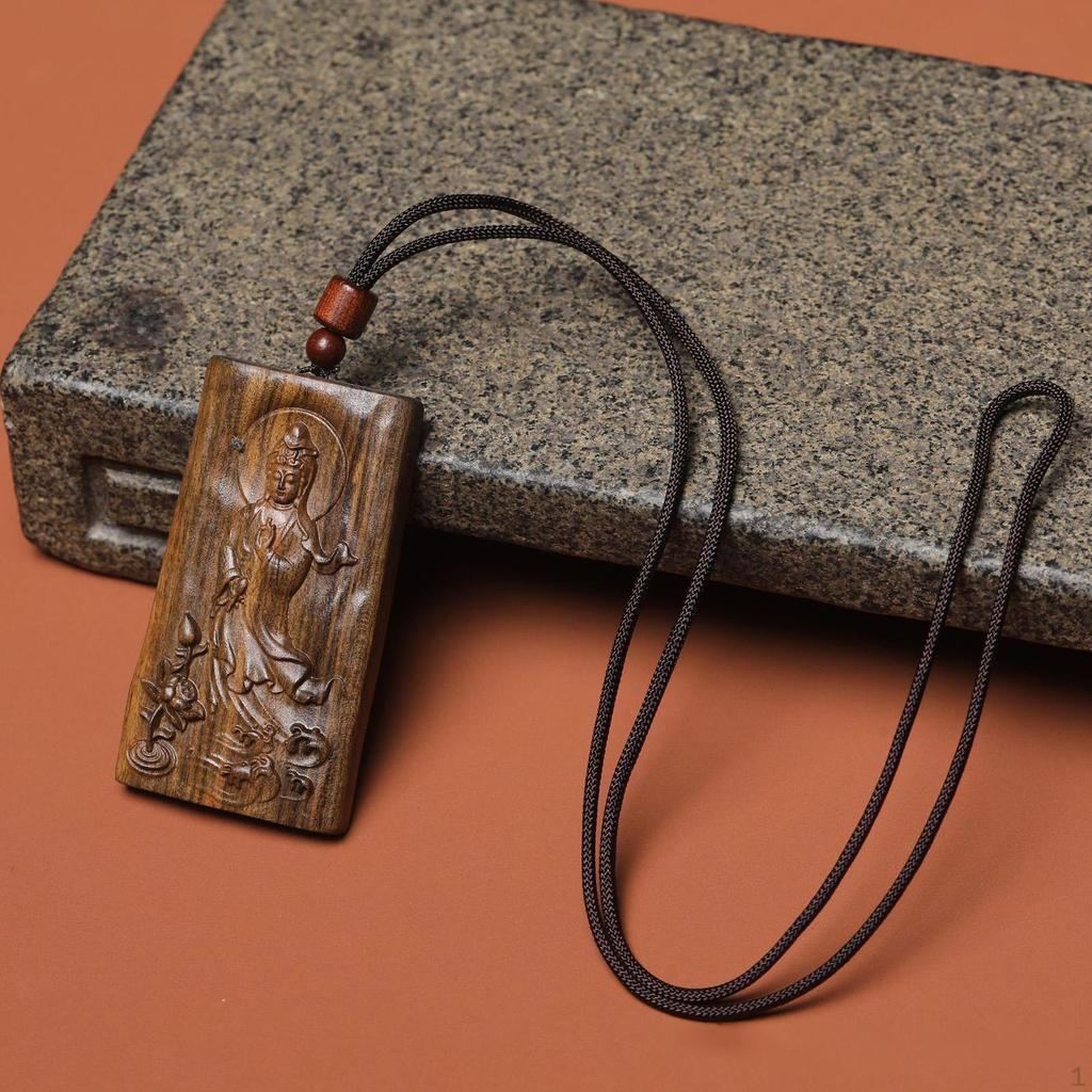 - 【Colgante de Bodhisattva】: Elaborada con palo de rosa antiguo, esta pieza de arte en madera muestra una artesanía intrincada y técnicas de talla tradicionales.