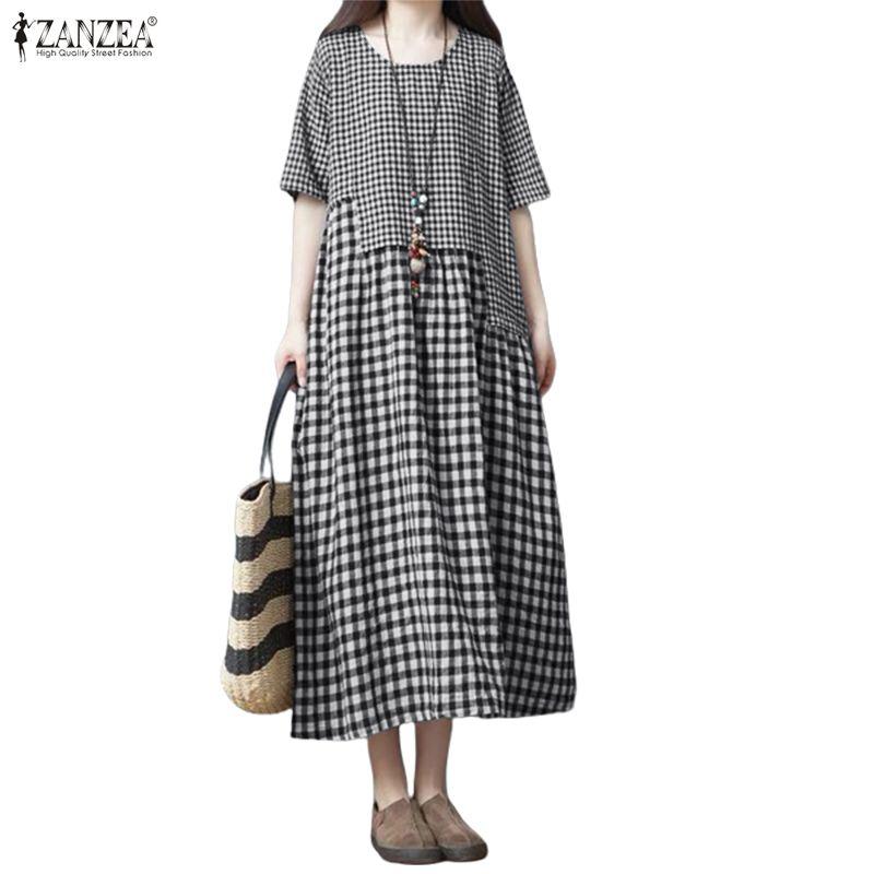ZANZEA Women Plaid Print Summer Casual O-neck Half Sleeve Long Dress