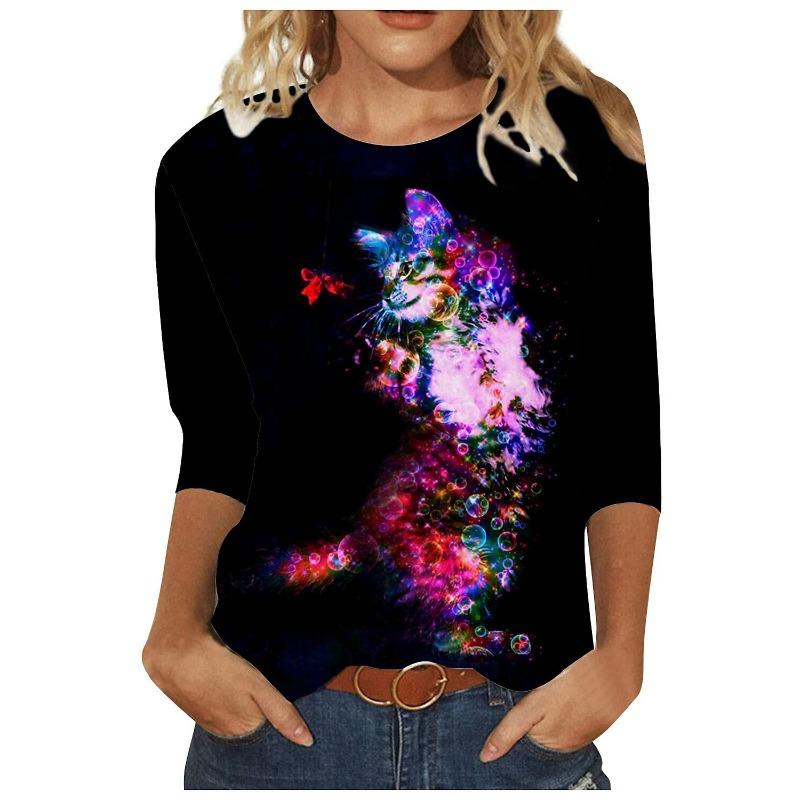 Round Neck 3D Cat Printed Top Casual Long Sleeved Women's T-shirts - Soft Medium Stretch Polyester Fabric Spring and Autumn Relaxed Fit Clothing