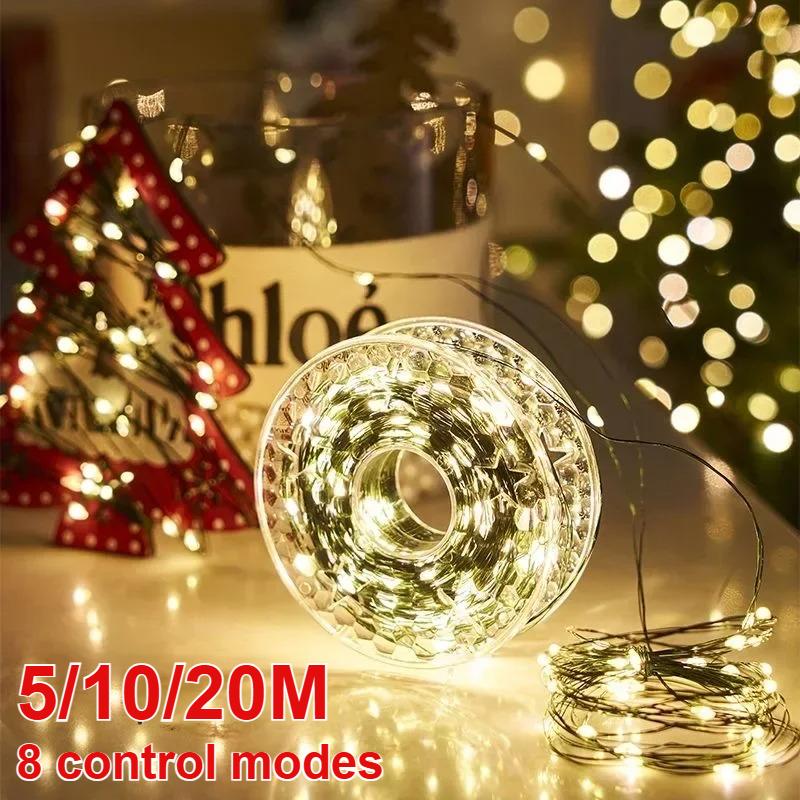 8 Modes Green Copper Wire Flower Wreath Light String 5/10/20M LED String Lights Christmas Wedding Party Decoration