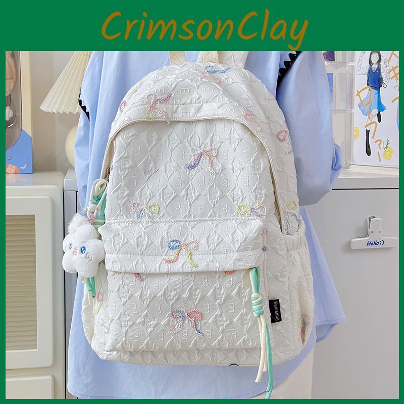 This student backpack features a spacious main compartment crafted from durable nylon, measuring approximately 12 inches in length, 5 inches in width, and 17 inches in height. It includes a geometric pattern design, with a comfortable curved shoulder strap system for ergonomic support. Available in multiple colors with decorative pendants, it is suitable for daily use, school, or travel. The interior is lined with polyester for easy maintenance, and the bag resists water splashes. Users can wipe it clean with a damp cloth to keep it looking new.