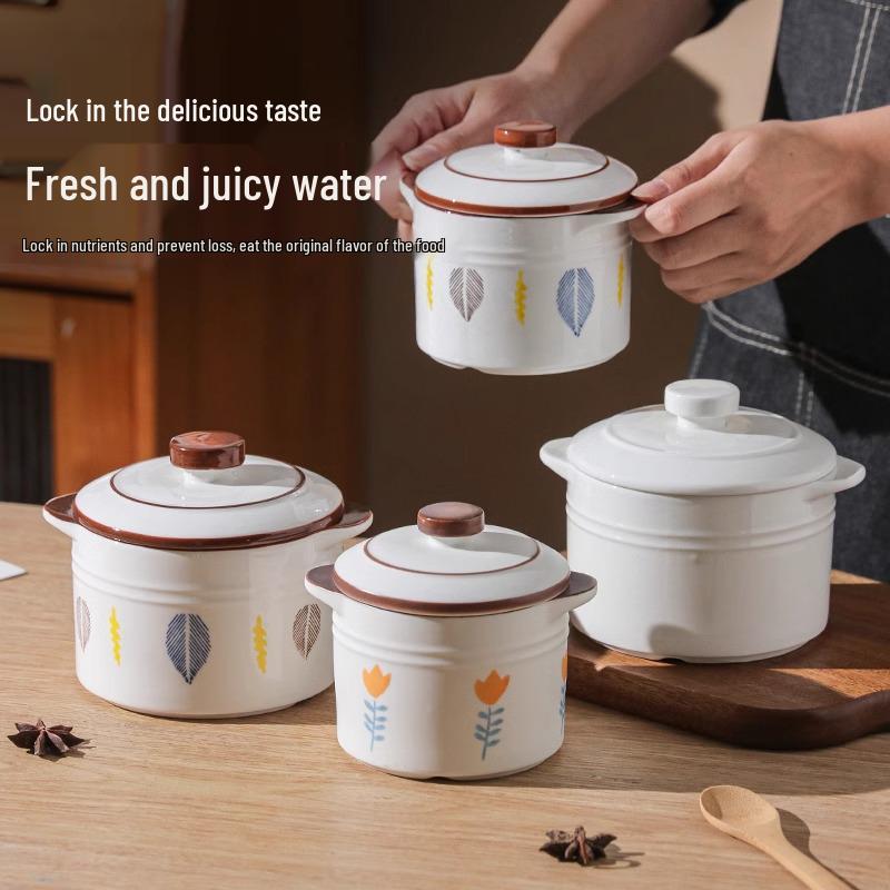 Double-Eared Insulated Ceramic Stewing Pot with Lid for Soups and Egg Custard