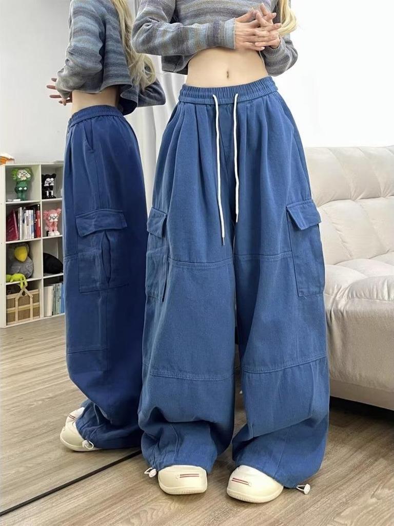 Trendy Unisex Deep Blue Wide-Leg Floor-Length Pants: Cool, Stylish, Plus-Size, Casual Spring/Summer Workwear.