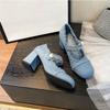 Nuevos zapatos de tacón alto de mezclilla con punta cuadrada y perlas, con tiras en los tobillos, tacón medio grueso liso, con cadena de metal, estilo retro, para uso diario, hechos a mano.
