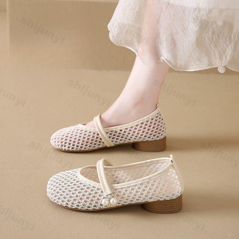 Fashion Women Mary Jane Shoes 2025 Summer Mesh Breathable Comfortable Casual Shoes Hollow Out French Dress Pearl Fashion Women's Shoes