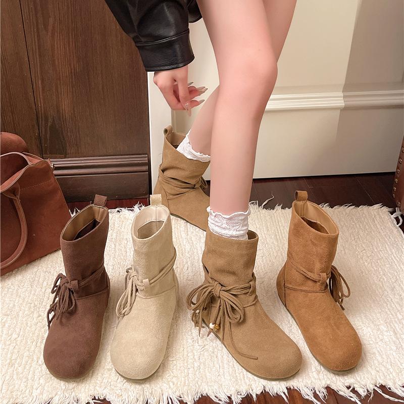 Fashion Women Ankle Boots Lace Up Shoes 2025 Autumn Fashion Suede Flat Bottom Casual Chelsea Short BotinesRetro Tassel Bow Botas Mujer