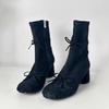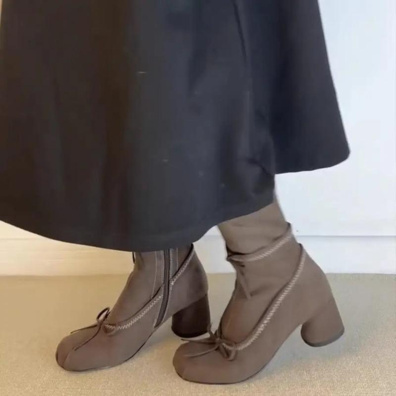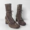 Fashion French Ballet Style Thick Heel Skinny Boots Women's Butterfly-Knot Round Toe Short Boots Side Zipper Elastic Mid-Calf Boots